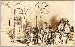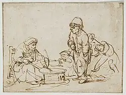 ![]() | A Child Being Taught to Walk | c. 1660-1662 | Pen and brown ink on brownish-cream paper | 9.3 x 15.4 cm | British Museum, London | Inscribed on reverse 'dit voor af te vragen / [vr]agen aen ons beijde oft wijt an de Heeren / [g?]oede mannen willen laten ver blijben / dan tijssen te vragen of Hij niet een / beijden d schilderien gelieft opgemaeckt te hebben / geen van beijden begerende.' |