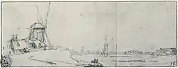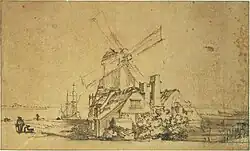 ![]() | Windmill on the Bastion Blauwhoofd in Amsterdam | c. 1641 | Oiled charcoal on brown tinted paper, framing lines with the pen in brown ink, gone over in pencil on the right side | 16.6 x 27.5 cm | Museum Boijmans Van Beuningen, Rotterdam | The drawing is related to the etching B233 |
