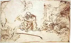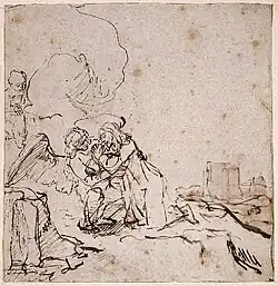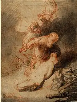 ![]() | The Angel Preventing Abraham from Sacrificing his Son, Isaac | 1635 | Red chalk over black chalk, with grey wash, on paper prepared with light brown wash | 19.5 x 14.7 cm | British Museum, London | Regarded as a preparatory drawing for the painting W136 |