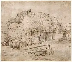 ![]() | Landscape with a Farmhouse and a Hay Barn | c. 1650-1652 | Pen, brown ink and brownish wash on light brown paper | 8.8 x 17.3 cm | National Gallery of Denmark, Copenhagen | The drawing is related to the etching B224 |