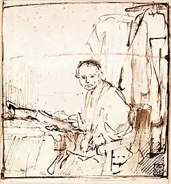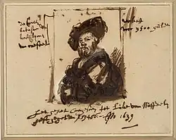 ![]() | Self-portrait | c. 1629 | Pen | 12.7 x 9.4 cm | Rijksmuseum Amsterdam | The drawing is related to the etching B338 |