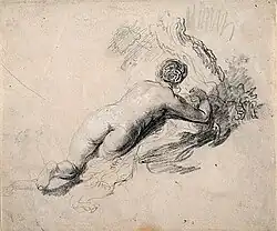 ![]() | Lying Naked Woman | c. 1632 | Black and white chalk on paper | 19.5 x 23.4 cm | Nationalmuseum, Stockholm | The drawing is related to the painting W130 |