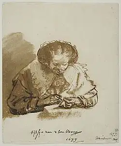![]() | Saskia Sitting up in Bed | c. 1638 | Pen and brush in brown, corrected with opaque white, tinted paper | 15 x 13.8 cm | Kupferstichkabinett, Dresden | The drawing is related to the etching B369 |