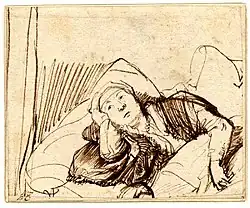![]() | Saskia Asleep in Bed | c. 1638 | Pen and brown ink | ? | Ashmolean Museum, Oxford | The drawing is related to the etching B369 |