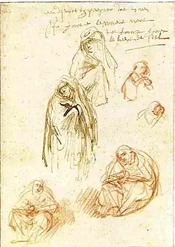 ![]() | Studies of Grieving Marys | c. 1637 | Pen in brown and red chalk | 20.1 x 14.3 cm | Rijksmuseum Amsterdam | Inscribed een dijvoot thresoor dat in een fijn harte bewaert wert tot troost harer beleevende siel |