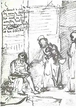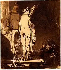 ![]() | Two Jews in Discussion, Walking | 1641-1642 | Black chalk, pen and brown | 9.7 x 8.4 cm | Teylers Museum, Haarlem | Inscribed .../ ...samson/ sijnd troni/ een(?) die een pijl wtreckt over/ ... schouder |