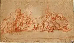 ![]() | The Last Supper, after Leonardo da Vinci | c. 1635 | Red chalk, heightened with white, on paper | 12.5 x 21 cm | British Museum, London | Inscribed R..b...dt |