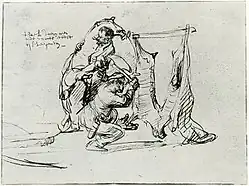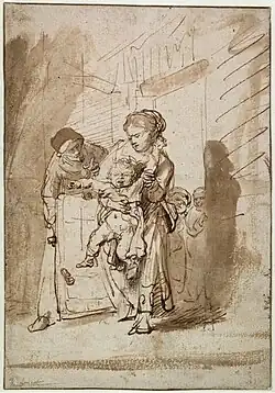 ![]() | Sheet of Studies, with a Woman Teaching a Child to Walk | c. 1646 | Pen and brown ink | 16 x 16.5 cm | Nationalmuseum, Stockholm | The drawing is related to the etching B194 |