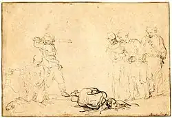 ![]() | Three Men Being Beheaded | c. 1640 | Pen and brown ink, corrected with white; framing lines in pen and brown ink | 15.3 x 22.6 cm | British Museum, London | The drawing is related to the etching B092 |
