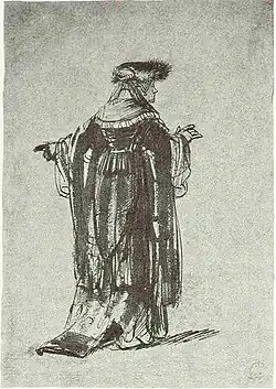 ![]() | Woman in a Rich Dress and a Fur Hat, Seen from Behind | c. 1639 | ? | ? | Museum der bildenden Künste, Leipzig | The drawing is related to the etching B109 |