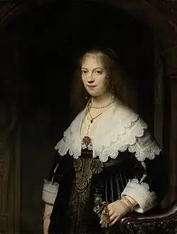 ![]() | Portrait of a Young Woman Holding Gloves | c. 1639 | Pen and brown iron-gall ink, with brown wash, heightened with white | 16 x 12.9 cm | British Museum, London | Regarded as a preparatory drawing for the painting W184b |