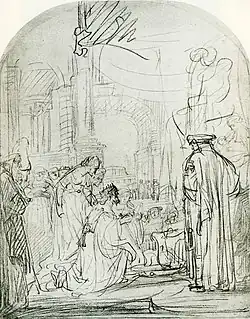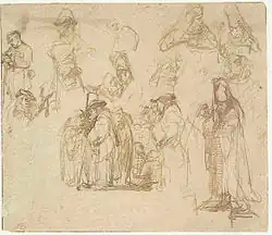 ![]() | Study for a Presentation in the Temple | c. 1639 | Pen and dark bistre | 18 x 19 cm | Amsterdam Museum | The drawing is related to the etching B049 |