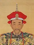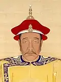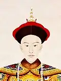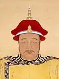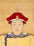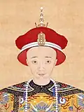Qing succession and inheritance policies made it difficult for empresses and their relatives to build power at court, as they had in the Han dynasty for example.[13] Threats to imperial power usually came from within the imperial clan.[14] When the young Fulin was chosen to succeed his father Hong Taiji in September 1643, two "prince regents" were selected for him: Hong Taiji's half-brother Dorgon (1612–1650) and Nurhaci's nephew Jirgalang (1599–1655). Soon after the Manchus had seized Beijing under Dorgon's leadership in May 1644, Dorgon came to control all important government matters.[15] Official documents referred to him as "Imperial Uncle Prince Regent" (Huang shufu shezheng wang 皇叔父攝政王), a title that left him one step short of claiming the throne for himself.[16] A few days after his death, he received a temple name (Chengzong 成宗) and an honorific posthumous title (Yi Huangdi 義皇帝, "Righteous Emperor"), and his spirit tablet was placed in the Imperial Ancestral Temple next to those of Nurhaci and Hong Taiji.[17] In early March 1651 after Dorgon's supporters had been purged from the court, these titles were abrogated.[18]