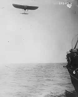 - First shipboard take-off and landing by an airplane: was made by Eugene Burton Ely, in a Curtiss Model D pusher, from a temporary platform aboard light cruiser USS Birmingham on November 14, 1910.[74] Ely was also the first to land an airplane on a ship, touching down on a temporary platform aboard armored cruiser USS Pennsylvania on January 11, 1911.[75]