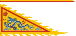 Subjects Annam and Tonkin Flag Date Use Description 1858–1885 Diplomatic flag of Dainamese empire [ 3] Yellow field with gold border (2:3). 1885–1890 Provisional flag of Dainamese empire National name (大南 Đại Nam ) centered on the yellow field (2:3). Influences: 1923 – 9 March 1945 Protectorate flag of Annam , Tonkin and Kouang-Tchéou-Wan French flag canton on a yellow field (2:3). Influences: Imperial standards Flag Date Use Description 1885–1890 Nguyễn dynasty by Cảnh Tôn Standard of Dainamese emperor, beside, used as the [provisional] national flag. Influences: 1890–1920 Nguyễn dynasty from Thành Thái to Hoằng Tôn A yellow field with a single red stripe. The flag of dragon and star, originally designed by Emperor Thành Thái .[ 4] [ 5] [ 6] Highly same as the Spanish flag . Influences: 1920 – 8 May 1945 Nguyễn dynasty from Hoằng Tôn to Bảo Đại The flag of dragon and star, used as the [official] national flag in 1945. Influences: Personal standards of emperors Flag Date Use Description 1802–1945 [Triangle] Personal standard of emperors of Nguyễn dynasty The flag of yellow and dragon (黃龍旗 / Hoàng-long kì) or emperor (天子旗 / Thiên-tử kì). Flag ratio is 1:2. 1922–1945 [Rectangle] Personal standard of emperors of Nguyễn dynasty (Hoằng Tôn and Bảo Đại ) Flag ratio is 2:3. Influences: 1802–1945 Imperial pennon of Nguyễn dynasty Flag ratio is 5:3.