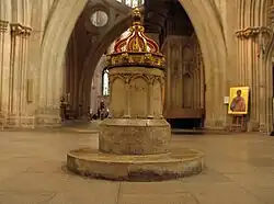 | Minster Church of St Andrew | 909 – 1175 | In c. 909 the Diocese of Sherborne, covering South-West England, was divided creating several new dioceses. Wells was chosen as the see for Somerset, and the town's minster, founded c. 705, became its cathedral. In 1090 a new bishop moved the see to Bath Abbey and built a new cathedral there. Despite Wells' loss of status, in 1176 a much larger building was begun, further north and on a different alignment, forming the basis of the present Wells Cathedral. (Wells became a cathedral city again in 1245.) A supposed font (shown), dated c. 700, is the only accessible material from the former cathedral. Excavations of the cloister garth 1978-80 located foundations of the former cathedral (see co-ordinates), which are almost undisturbed.[79][80] | 51°12′36″N 2°38′38″W / 51.210016°N 2.643953°W |