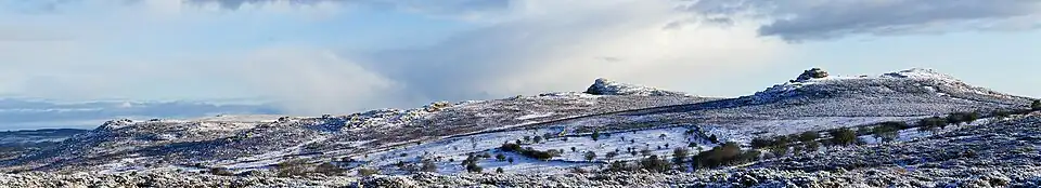 Dartmoor represents one of the largest areas of exposed granite in the United Kingdom, covering an area of 368 square miles (950 km2).[1] It is part of a chain of granite stretching through Cornwall, as far as the Isles of Scilly.