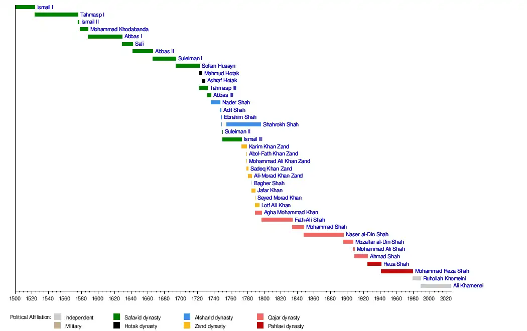 | 1 | Shah Ismail I | | 1487–1524 | July 1501[a] | 23 May 1524 | Safavid | |
