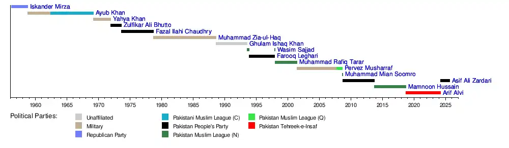 | (11) | | Asif Ali Zardari (born 1955) | 10 March 2024 | Incumbent | 1 year, 165 days | PPP | 2024 | ||