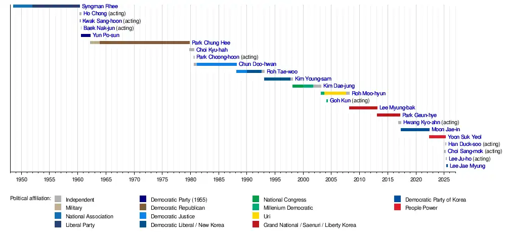 - ^ Yoon was impeached by the National Assembly on 14 December 2024. Powers and duties were assumed by prime minister Han Duck-soo as acting president. Yoon was removed from office after the impeachment was upheld by the Constitutional Court on 4 April 2025.[11]