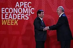 On the sidelines of the meeting, President Duterte held bilateral meetings with Chinese President Xi Jinping and Russian President Vladimir Putin. Duterte met with Xi to discuss the alignment of the former's foreign policy towards Asian economic development, to follow up on the memorandum of understandings signed during the former's state visit to Beijing in October, and to discuss the permission of Filipino fisherman to enter the disputed Scarborough Shoal.[73] Duterte met with Putin to discuss the development of Philippines–Russia relations. Duterte also praised Putin's leadership skills, calling him his "idol", and the latter invited the former to visit Russia.[74][75]