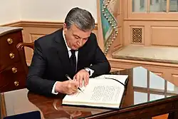 State visits State visit of Russian President to Uzbekistan in October 2018 Country Name Title Date United Nations António Guterres UN Secretary-General June 10–11, 2017 Kazakhstan Nursultan Nazarbayev President of Kazakhstan September 16–17, 2017 Kyrgyzstan Almazbek Atambayev President of Kyrgyzstan October 5–6, 2017 Afghanistan Ashraf Ghani President of Afghanistan December 4–5[ 55] Kyrgyzstan Sooronbay Jeenbekov President of Kyrgyzstan December 13–14, 2017 Turkmenistan Gurbanguly Berdimuhamedov President of Turkmenistan April 23–24, 2018 Turkey Recep Tayyip Erdoğan President of Turkey April 29 – May 1, 2018 Tajikistan Emomali Rahmon President of Tajikistan August 16–17, 2018[ 56] Egypt Abdel Fattah el-Sisi President of Egypt September 4–5, 2018[ 57] Belarus Alexander Lukashenko President of Belarus September 13–14, 2018 Russia Vladimir Putin President of Russia October 18–19, 2018[ 58] Kazakhstan Kassym-Jomart Tokayev President of Kazakhstan April 14, 2019 South Korea Moon Jae In President of South Korea April 18–21 2019[ 59] Germany Frank-Walter Steinmeier President of Germany May 27–29, 2019[ 60] Kyrgyzstan Sadyr Japarov President of Kyrgyzstan March 11–12, 2021 Hungary Viktor Orban Prime Minister of Hungary March 30, 2021 Pakistan Imran Khan Prime Minister of Pakistan July 15–16, 2021 Turkmenistan Gurbanguly Berdimuhamedov President of Turkmenistan October 4–5, 2021 Turkey Recep Tayyip Erdoğan President of Turkey March 29–31, 2022 Tajikistan Emomali Rahmon President of Tajikistan June 2–3, 2022 Azerbaijan Ilham Aliyev President of Azerbaijan June 21–22, 2022[ 61] Turkmenistan Serdar Berdimuhamedow President of Turkmenistan July 14–15, 2022 Iran Ebrahim Raisi President of Iran September 14–16, 2022 China Xi Jinping General Secretary of the Chinese Communist Party President of China September 14–16, 2022 European Union Charles Michel President of the European Council October 28, 2022 Kazakhstan Kassym-Jomart Tokayev President of Kazakhstan December 21–22, 2022 Singapore Halimah Yacob President of Singapore May 23-25, 2023 Qatar Tamim bin Hamad Al Thani Emir of Qatar June 4-5, 2023 France Emmanuel Macron President of France November 1-2, 2023 Italy Sergio Mattarella President of Italy November 9-11, 2023 Qatar Tamim bin Hamad Al Thani Emir of Qatar December 19, 2023 Belarus Alexander Lukashenko President of Belarus February 7–8, 2024 Kazakhstan Kassym-Jomart Tokayev President of Kazakhstan April 5, 2024 Malaysia Anwar Ibrahim Prime Minister of Malaysia May 17-19, 2024 Russia Vladimir Putin President of Russia May 26-27, 2024 South Korea Yoon Suk Yeol President of Korea June 13-15,2024 Mongolia Ukhnaagiin Khürelsükh President of Mongolia June 23-26, 2024 United Nations António Guterres UN Secretary-General June 30 July 1, 2024 Kyrgyzstan Sadyr Japarov President of Kyrgyzstan July 18-19, 2024 Azerbaijan Ilham Aliyev President of Azerbaijan August 22–23, 2024 Germany Olaf Scholz Chancellor of Germany September 15-16, 2024