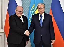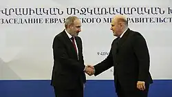 2020 Mishustin with President of Kazakhstan Kassym-Jomart Tokayev in Nur-Sultan , on 1 February 2020 Mishustin with President of Belarus Alexander Lukashenko , in Minsk , on 3 September 2020 Mishustin with Prime Minister of Armenia Nikol Pashinyan , in Yerevan , on 9 October 2020