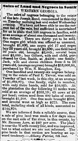 | Joseph Bond estate auction[1] | 566 | January 3, 1860 | Albany, Georgia | Joseph Bond | US$580,150 (equivalent to $20,303,101 in 2024) | ||
