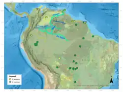 | 1b | Northern green anaconda (asserted distinct in 2024) | "Eunectes akayima" (asserted distinct in 2024) | Boidae | Similar in maximum weight to that listed above for the southern green anaconda | ![]() | Similar in maximum length to that listed above for the southern green anaconda 6.30 m (20.7 ft), reliable, maximum weight listed in the study by Rivas et al. [18] | ![]() Specimens from light green circled locations |