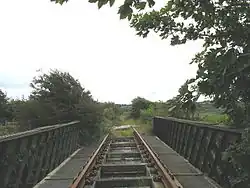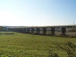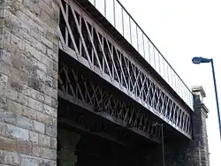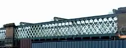 | Montrose Viaduct | 1880 | The end span (see photo) is a conventional Town-type lattice. However, the bulk of this long viaduct consists of longer spans each of which has been strengthened by adding a small degree of upward curvature to the upper horizontals. This makes this structure a unique example of a Town-type bowstring lattice. | ![]() |
