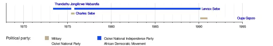 | Lennox Sebe (1926–1994)[l] | 4 December 1981 | 4 March 1990 (Deposed)[18] | 8 years, 90 days | CNIP | |||