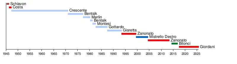 Mayor Term start Term end Party 1 Giuseppe Schiavon 28 April 1945 19 April 1946 PCI 2 Gastone Costa 19 April 1946 26 April 1947 PSIUP 3 Cesarino Crescente 26 April 1947 12 December 1970 DC 4 Ettore Bentsik 12 December 1970 5 May 1977 DC 5 Luigi Merlin 5 May 1977 9 April 1980 DC (4) Ettore Bentsik 9 April 1980 28 April 1981 DC 6 Guido Montesi 28 April 1981 26 August 1982 DC 7 Settimo Gottardo 26 August 1982 7 June 1987 DC 8 Paolo Giaretta 7 June 1987 6 June 1993 DC 9 Flavio Zanonato 6 June 1993 8 May 1995 PDS