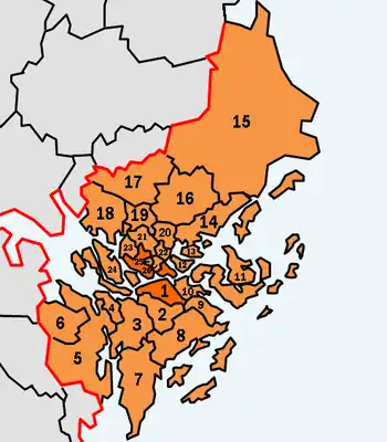 | Värmdö | 40,660 | 448.03 | 89.91 | Northern Suburbs (Uppland) |