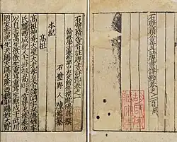 | $21.4 | $17.06 | 石壁精舍音註唐書詳節; Shíbì jīngshè yīnzhù Tángshū xiángjiē "Book of Tang in detailed sections with glosses by 'Stone Wall Studio'". Woodblock printed edition. Copy previously owned by Cao Kun (1862–1938). | Ouyang Xiu (comp.) Chén Jiàn 陳鑒 (ed.) | c. 1230s | June 2018 | | [14][15] | |