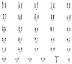 The list of organisms by chromosome count describes ploidy or numbers of chromosomes in the cells of various plants, animals, protists, and other living organisms. This number, along with the visual appearance of the chromosome, is known as the karyotype,[1][2][3] and can be found by looking at the chromosomes through a microscope. Attention is paid to their length, the position of the centromeres, banding pattern, any differences between the sex chromosomes, and any other physical characteristics.[4] The preparation and study of karyotypes is part of cytogenetics.