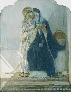 | 1898[133][134] 39 years old | Visits U.S. in August 1897 after return to Paris from Holy Land. Returns to Paris September 1897 from US.[127] Announces, that after he returns to Paris, he will paint an Eastern type Virgin Mary dressed in clothes from the Holy Land.[127][128][135] Tanner probably did not use Jessie McCauley Olssen (his future wife) for the girl.[136] | The Virgin Mary is visited by the archangel Gabriel, who delivers the Annunciation of the Lord, the announcement that she would bear Jesus. | The Annunciation[133][134] | Philadelphia Museum of Art, W1899-1-1. 57 x 71 1/4 in (1,448.82 mm x 1,811.27 mm)[133][134] | ![]() | ![]() |