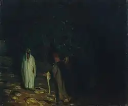 | 1899[146][154] 40 years old | Tanner took a second trip to the Holy Land, in 1898–99.[146] | The painting illustrate the biblical story of Nicodemus a Pharisee who visited Jesus to talk to him. 1899 Paris Salon entry.[152] | Nicodemus Visiting Jesus.[146] or Nicodemus[154] or Nicodemus Coming to Christ[155] | Pennsylvania Academy of the Fine Arts, 1900.1. Oil on canvas, 33.11/16 × 39.5 in (85.5 × 100.3 cm).[146][154] | ![]() | ![]() |