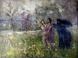 | c. 1898[151] 39 years old | Exhibited in May 1899 at the Pennsylvania Museum and School of Art and January 1901 at the Pennsylvania Academy of the Fine Arts.[152] | And He Vanished Out of Their Sight[151] or And He Disappeared Out of Their Sight[152] | Location unknown (possibly lost). Oil on canvas, 25 3/4 x 32 in.[151] Photo in collections of Pennsylvania Academy of the Fine Arts[151] and the Smithsonian Archives of American Art.[153] | ![]() | ![]() | |