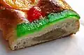 | Ensaïmada | | Spain(Balearic Islands) | A common cuisine eaten in most former Spanish territories in Latin America and the Philippines, prepared using strong (high protein) flour, water, sugar, eggs, mother dough and a kind of reduced pork lard named saïm. In Ibiza there is a sweet called greixonera made with ensaimada pieces left over from the day before.[37] |