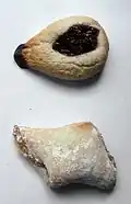 | Hamantash | | Jewish (Ashkenazi) | A filled-pocket cookie or pastry in Ashkenazi Jewish cuisine recognizable for its three-cornered shape and eaten as part of the holiday of Purim. They typically have a filling in the center. including poppy seed (the oldest and most traditional variety),[40] prunes, nut, date, apricot, apple, fruit preserves, cherry, chocolate, dulce de leche, halva, or even caramel or cheese.[41] Their formation varies from hard pastry to soft doughy casings. |