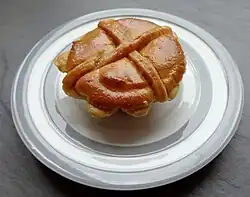 | Hot Cross Bun | United Kingdom | A hot cross bun is a traditional baked treat, typically made from a soft, spiced dough enriched with raisins or currants. It's known for its distinctive cross-shaped marking on top, often made of icing or a simple flour paste. Hot cross buns are commonly enjoyed as a seasonal delicacy during the Easter period, symbolizing the crucifixion of Jesus Christ on Good Friday. They are usually served toasted and buttered, making for a deliciously comforting snack or breakfast item. | |