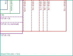 | 127 | roll film | 1912 | Present | 1+5⁄8 × 2+1⁄2 in 1+5⁄8 × 1+5⁄8 in 1+5⁄8 × 1+1⁄4 in | 8 12 16 | 46 mm stock, "Vest Pocket" | |