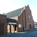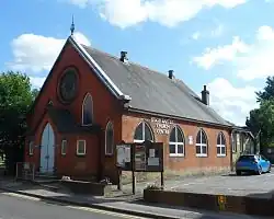 Protestant Nonconformism has a long history in the borough. William Bugby founded Bugby Chapel in Epsom in 1779; he was influenced by famous Calvinist preacher William Huntington, whose early preaching and first conversion of another person took place at West Ewell. The chapel later adopted a Unitarian character, then it became Salem Strict Baptist Chapel. In 1954, after this congregation moved to a new chapel, the building was rededicated as a synagogue—a role which it retained until the 1990s.[24] Illegal Presbyterian meetings took place in Epsom from 1667, or possibly as early as the Great Ejection which followed the Act of Uniformity 1662, and congregations rose to 300 by the early 18th century. A permanent meeting room was licensed in 1724; after a period of closure it was reopened as an Independent Congregational church in 1805. This building was restored in 1846, but a new church was built in 1904. This was damaged by fire in 1961, and the present Epsom United Reformed Church—successor to the 17th-century cause—was completed in 1963.[25][note 2] Baptists have met in Epsom since 1899,[27] and their present chapel was registered for marriages in 1909.[28] A Strict Baptist congregation which met at Bugby Chapel from 1899 later moved to a new building elsewhere in Epsom.[24] There was a Wesleyan Methodist chapel in Epsom from 1847, when a barn was converted for the use of worshippers, and the present town-centre building was completed in 1914.[29] Stoneleigh also has its own Methodist and Baptist churches, both registered for marriages in the early 1940s.[30][31] In the postwar period, several Evangelical groups opened churches in Epsom and Ewell, such as the Epsom Christian Fellowship,[32] Christ Church Ewell (originally Staneway Chapel)[33] and West Ewell Evangelical Church.[34] Jehovah's Witnesses meet at a Kingdom Hall at Banstead Road in Ewell,[35] and nearby on the same road is a Latter-day Saints meetinghouse.[36] This made headlines in 1977 when a Latter-day Saint missionary was abducted from outside it in a sex scandal which became known as the Mormon sex in chains case.[37] There is a mosque and Islamic community centre in a former church hall in Epsom,[38] and at Stoneleigh a building is used as a Hindu temple and prayer hall.[39]