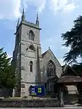 Ewell developed from 70 AD around a bend in Stane Street, a major Roman road. It was Surrey's largest settlement by 150 AD.[8] Land in the area was later within the royal demesne or—in the case of the manor of Fitznells, documented as early as 675—owned by Chertsey Abbey. Its ancient parish church, dedicated to St Mary the Virgin, was replaced by a new church within the same churchyard in 1848, but the 15th-century tower survives from the earlier building.[13] Land in the Epsom area was granted to Chertsey Abbey in 727, and the manor of Epsom still belonged to it at the time of the Domesday survey in 1086. At that time there were two churches in Epsom, "but all trace of one has disappeared"; the other, the much rebuilt[14] St Martin's Church, is still the town's parish church.[15] Cuddington, a medieval village near Ewell with its own church, was demolished in the 16th century to allow Nonsuch Palace and its associated parks to be built.[16] The parish name is still in use today,[17] and a new church was built in the Worcester Park suburb in the north of the district.[16] Other Anglican churches were provided throughout the Victorian era and into the 20th century as the population grew: Christ Church, St Barnabas' and St John's in Epsom,[15] All Saints at West Ewell,[13] St John the Baptist's Church at Stoneleigh (1939),[18] St Stephen-on-the-Downs at Langley Vale (1961)[19] and St Paul's at Howell Hill, between Ewell and Cheam (1989).[20]