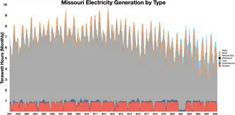 This is a list of electricity-generating power stations in the U.S. state of Missouri. In 2023, Missouri had a total summer capacity of 21,172 MW through all of its power plants, and a net generation of 66,703 GWh.[2] In 2024, the state's electrical energy generation mix was 57.2% coal, 15.5% nuclear, 15.1% natural gas, 10% wind, 1.5% hydroelectric, 0.3% solar, 0.2% petroleum, and 0.2% biomass.[1] Small-scale solar, which includes customer-owned photovoltaic panels, delivered an additional net 762 GWh of energy to the state's electrical grid in 2024. This was more than three times the amount generated by Missouri's utility-scale photovoltaic plants.[1]