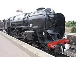 No. 92212 was one of the last 9Fs to be built, being turned out from Swindon in September 1959. First allocated to Banbury, it was transferred in June 1961 to Bath (Green Park) for working over the Somerset and Dorset route to Bournemouth, it was transferred to Ebbw Junction, Newport in September 1961 and then to Tyseley in July 1962.[15] It remained there until November 1966, when it spent its last months at Carnforth.[15] The locomotive was sold to Woodham Brothers scrapyard in Barry, South Wales, where it arrived in January 1968. It was then bought by 92212 Holdings Ltd, and moved to the Great Central Railway at Loughborough in September 1979. Restoration was completed in September 1996, and the engine is based at the Mid-Hants Railway. Following a major overhaul lasting just over two years, in which time it was purchased by Jeremy Hosking, the locomotive returned to operational service on 11 September 2009. 92212 was hired to the Bluebell Railway to provide cover during its current motive power shortage. The locomotive returned to the Mid-Hants Railway in 2013. 92212's boiler certificate has now expired on December 31, 2019 and its final day in service was December 31, 2019, that is New Year's Day. In April 2020 the locomotive was moved to the Llangollen Railway where it will be overhauled.[16]