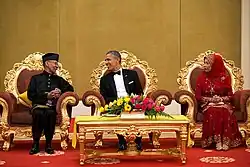 | Malaysia | Kuala Lumpur | April 26–28 | President Obama was greeted with a welcoming ceremony outside the Malaysian Houses of Parliament, where he was accompanied by Yang di-Pertuan Agong Abdul Halim and Prime Minister Najib Razak.[42] In the evening, the President was also hosted a state dinner by Yang di-Pertuan Agong Abdul Halim and Raja Permaisuri Agong Sultanah Haminah Hamidun at the Istana Negara.[43] On April 27, President Obama visited the National Mosque of Malaysia, before holding a bilateral meeting and a joint press conference with Prime Minister Najib at the Perdana Putra to discuss issues on trade, defense, and maritime security, as well as the United States' commitment to contributing to the search for Malaysia Airlines Flight 370.[44] He also delivered remarks at the Malaysian Global Innovation and Creativity Centre and participated in the Young Southeast Asian Leaders Initiative Town Hall meeting at the University of Malaya.[39] | |
