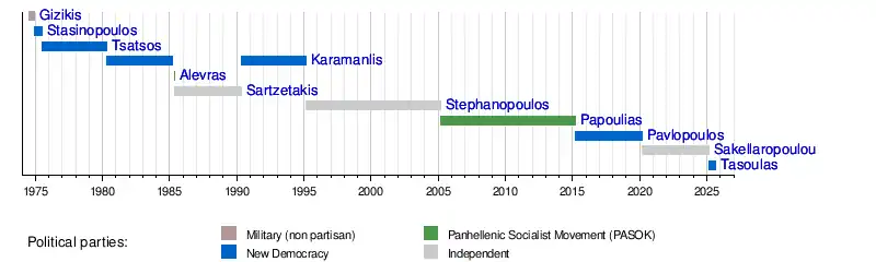 | 6 | | Karolos Papoulias Κάρολος Παπούλιας (1929–2021) | 2005 2010 | 12 March 2005 | 13 March 2015 | 10 years, 1 day | PASOK |