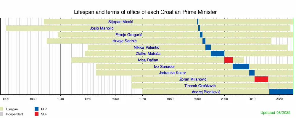 This is a graphical lifespan timeline of prime ministers of Croatia. They are listed in order of office.