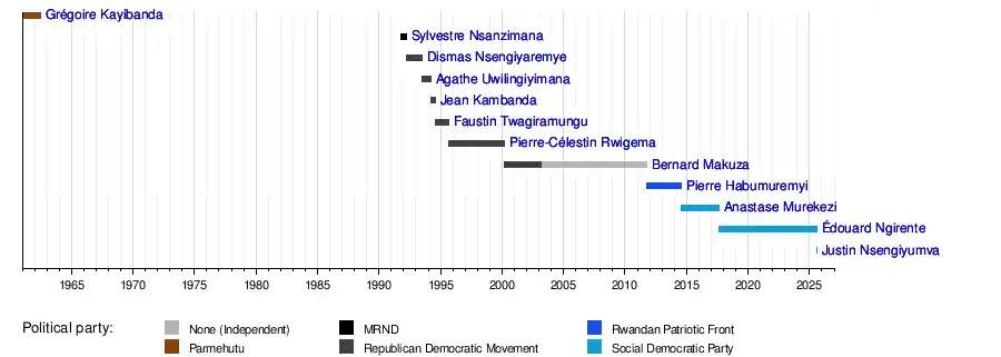 | 1 | | Grégoire Kayibanda (1924–1976) | 28 January 1961 | 1 July 1962 | 1 year, 154 days | Hutu | Parmehutu | Dominique Mbonyumutwa (1961) | ||